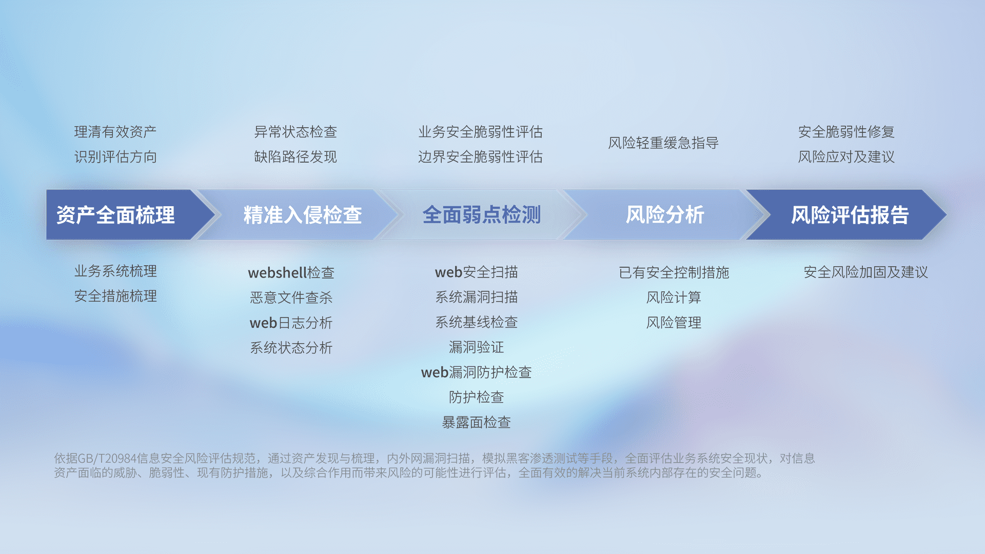 针对客户行业特性,,,,以专业的安全服务+多厂商联合解决方案提供专属的一站式安全管理服务,,帮助客户全面感知网络空间威胁,,,基于识别、、检测、、、、分析、、防护、、监测、、、、响应的服务理论模型,,,,从方案咨询、、、、集成交付、、、、评估验证、、优化加固、、、运维运营,,,致力于为客户提供完整的闭环管理式安全服务。。以实战经验为客户打造高抵御风险的安全体系,,,帮助客户发现威胁、、对抗威胁、、处置威胁,,,不断积累安全对抗能力,,,,持续保障数字化安全。。。。